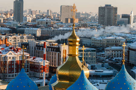 Beautiful panoramic picture of Kazan city center on the sunset, Tatarstan, Russia. Capital of the Republic of Tatarstan. Buildings and landmark line with sunny weather. Panorama of the sights.