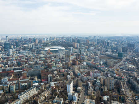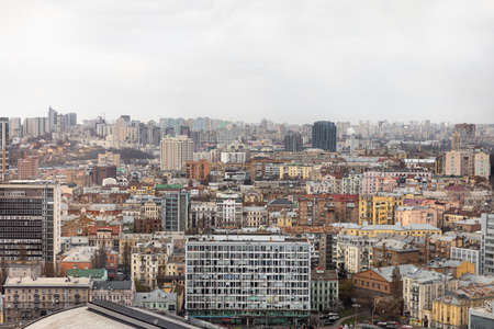 Kyiv, Ukraine - Apr. 01, 2020: Aerial view of the roofs and streets of the city of Kyiv. Old and modern architecture of Kyiv city center. View from Parus Business Centre