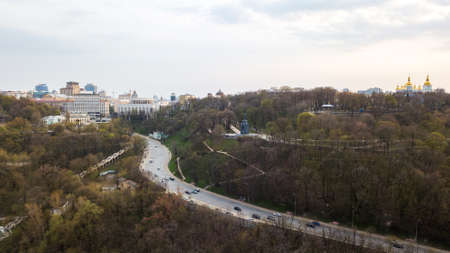 Panoramic aerial view from the drone, a view of the birds eye view of the the oldest historical central part of the city of Kiev, Ukraine.
