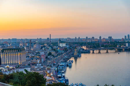 The panoramic birds eye view from drone to the central historical part of the city Kiev - the Podol district, the Dnieper River in Kiev, Ukraine at summer sunset.