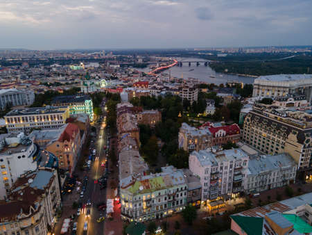 Aerial top view of Kyiv cityscape of Vozdvizhenka and Podol historical districts on sunset from above, city of Kiev, Ukraine