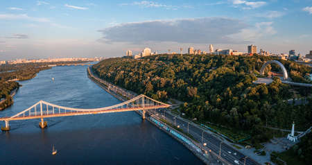 Aerial view of pedestrian Park bridge and Dnipro river