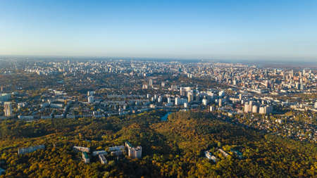 Golden autumn Kyiv cityscape, aerial drone view of city skyline and forest with yellow trees and beautiful landscape from above, Kiev, Goloseevo forest, Ukraine