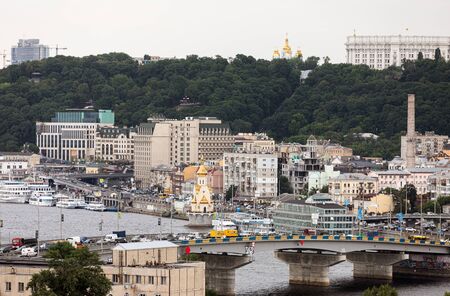 KYIV, UKRAINE - Jun 04, 2019: Kiev district Podil. View of the Dnieper River, Havana Bridge and Vladimir Hill
