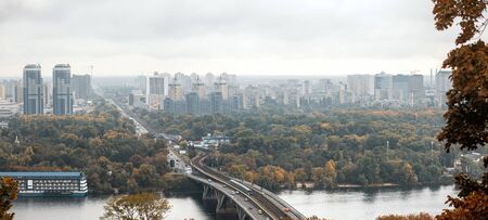 Urban landscape of modern European city. View to Left part of Kiev and Dnipro river from Botanical Garden in Autumn