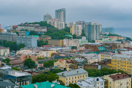 Summer, 2015 - Vladivostok, Russia - Aerial. The central historical part of the city of Vladivostok from a height. Historic buildings in the center of Vladivostok