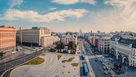 Moscow, Russia - 23 Jul 2020: General landscape view at tradition Moscow architecture. City life on the central streets of the city. The citizens go on their own business. Automobile traffic.