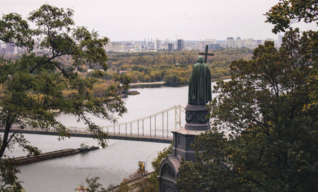 travel to Ukraine - Saint Vladimir Monument in Kiev city and view of Dnieper River in urban park Volodymyrska Hill (Saint Volodymyr Hill, Volodymyrska hirka, Vladimirskaya gorka) in summer&