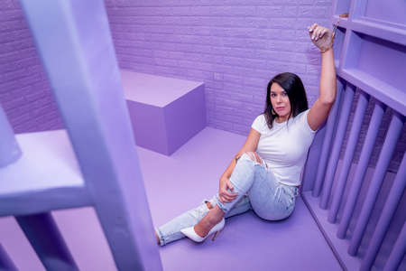 A beautiful asian model is jailed in a lavender cell waiting to plead her case