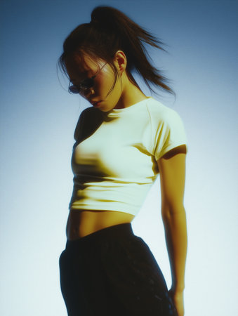 Fashion portrait of a young sporty, beautiful Asian woman wearing sunglasses.