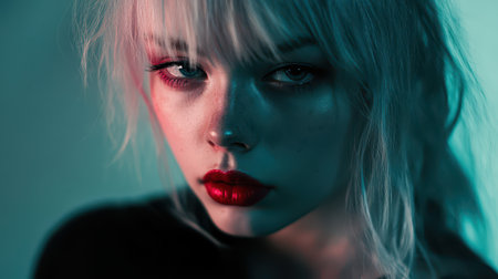 A young woman poses with bold red lips and intense eye makeup illuminated by dramatic turquoise lighting in a close up portrait.