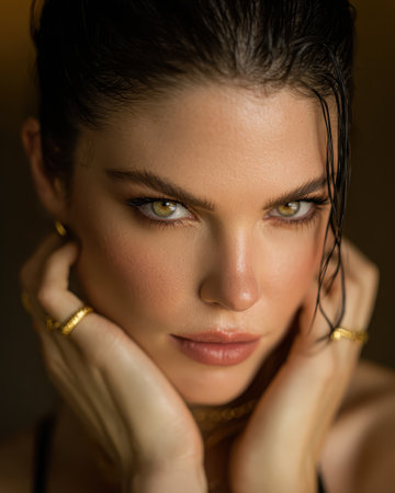 Wet-haired woman stares fiercely, hands framing face in warm golden light. AI-generated.