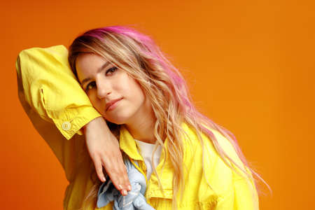 Portrait of a confident young woman wearing a trendy orange hoodie with a casual and fashionable pose against a soft gradient background.
