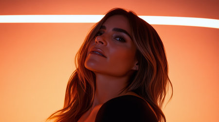 A brunette woman with long hair is looking up towards a light source. She poses against a warm orange background, illuminated by a bright overhead light. She is wearing a black top.