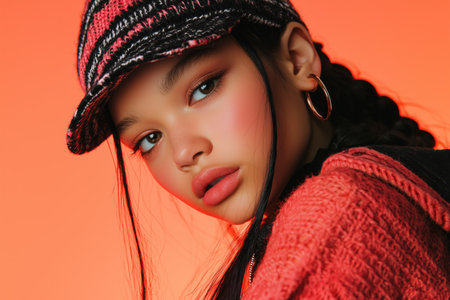 A captivating portrait featuring a young woman with braids, radiating confidence against a soft pink background, showcasing beauty and elegance.