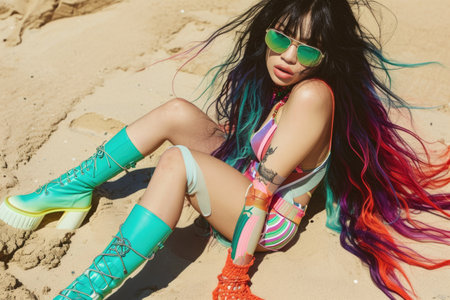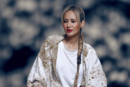 photo of asian woman in jacket outfit with colorful light in background, generative AI