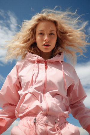 Portrait of a young woman wearing a colorful pastel windbreaker jacket, posing confidently against a warm gradient background. Casual and stylish concept.