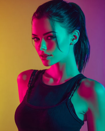 A young woman poses confidently against a colorful background, showcasing vibrant lighting in shades of pink and teal. Her expression is captivating and cool.
