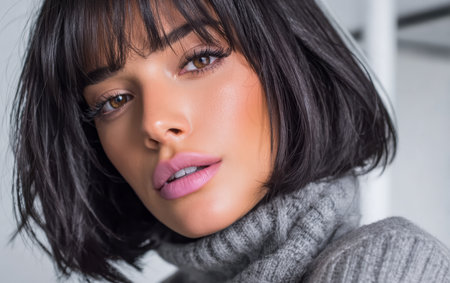 A woman poses for a close-up shot, showcasing her short dark hair and wearing a soft gray sweater. The bright background highlights her youthful features and natural makeup.
