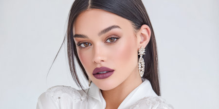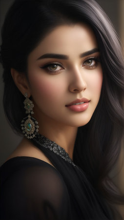 A woman with long dark hair and delicate features poses with a captivating expression. She wears intricate earrings and a dark outfit creating a striking contrast against the backdrop.