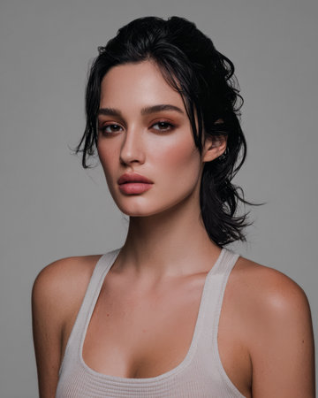 A woman stands with a serious expression wearing a light tank top. She has dark hair styled up and displays makeup with natural tones. The background is gray and unadorned.