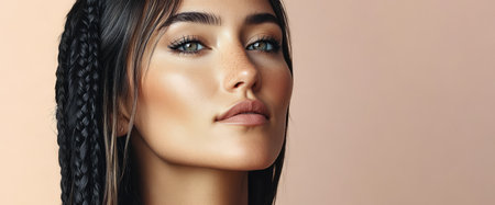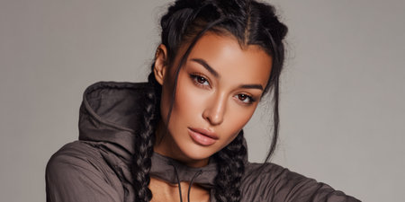 A young woman with intricate braided hair showcases her natural beauty in a close-up portrait. Her expressive eyes and clear skin create an empowering and captivating presence.