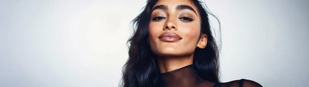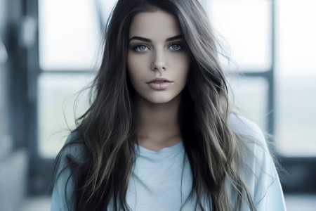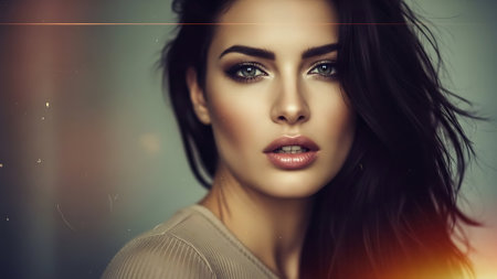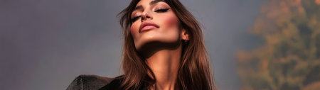 Captured in a soft ambient light a woman with long flowing hair displays a graceful expression. Her makeup highlights her features emphasizing the beauty of her eyes and lips.
