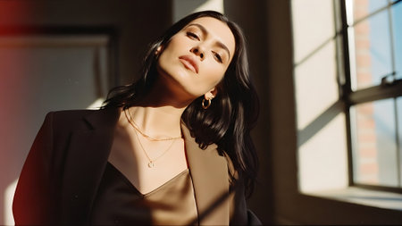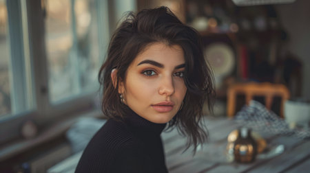 Portrait of a diverse woman with a captivating look in a residential setting