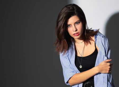 serious young girl posing in Studio in bright shadow light. free space for copy paste
