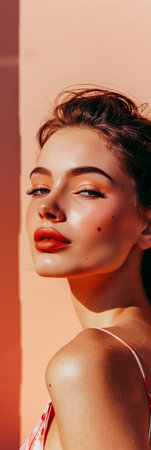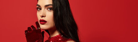 A young woman showcases her beauty in a vibrant red studio, featuring striking makeup and style, banner