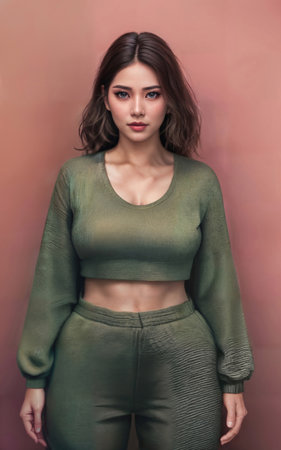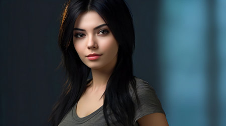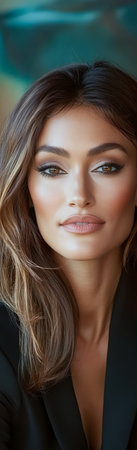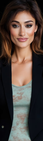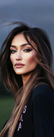A woman poses confidently showcasing her glowing skin and captivating green eyes. Her long dark hair flows freely complementing the relaxed look she wears.