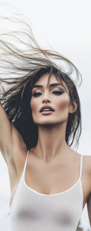 A model stands confidently with her hair blowing in the wind showcasing a relaxed yet striking expression. The cloudy sky provides a muted backdrop enhancing the mood of the moment.