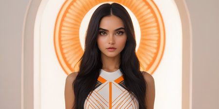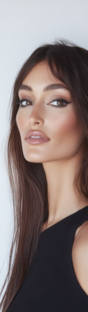 A young woman with long flowing dark hair stands in a confident pose. She has striking features and a subtle makeup look showcasing her natural beauty against a smooth neutral backdrop.
