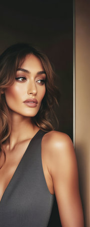 A graceful woman stands close to a wall the soft lighting accentuating her features. Her wavy hair cascades around her shoulders and her expression is calm and poised embodying elegance.