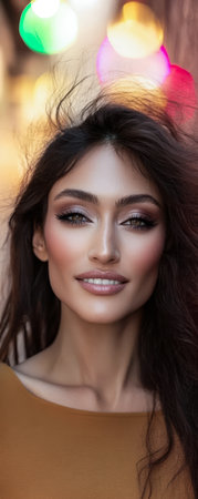 A young woman with long hair smiles confidently in an urban environment. Soft golden hour light enhances her features creating a warm and inviting atmosphere. Colorful lights blur in the background.