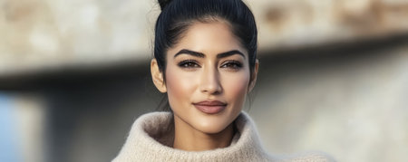 Portrait of a beautiful young brunette woman in a warm sweater.