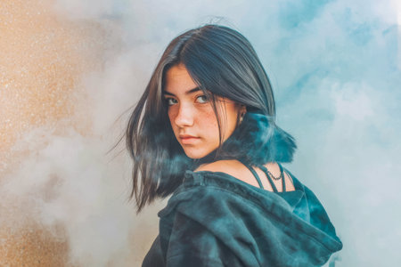 A person poses with a direct gaze while wearing a hooded jacket. The background is plain and focuses on their facial features and hairstyle. The lighting highlights the subject's expressions.