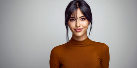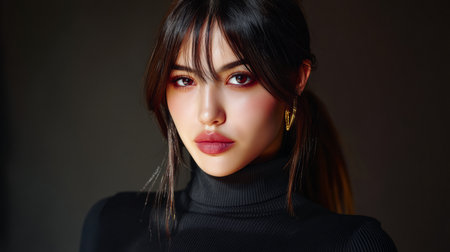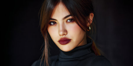 A young woman poses in a black turtleneck, her long dark hair styled elegantly. Soft light highlights her features, creating a captivating and dramatic look.