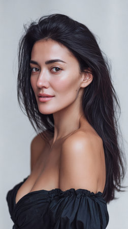 A woman with long dark hair is striking a confident pose. Wearing an off-shoulder top, she showcases a natural look in soft light. Her expression reflects grace and poise.