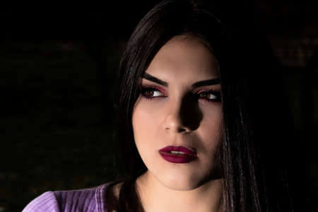 A young woman poses confidently with dark lipstick and styled hair in a dimly lit environment. Her expression is bold and captivating, drawing attention to her features and elegance.
