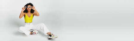 joyful african american woman adjusting blue sunglasses and sticking out tongue while sitting on grey, banner