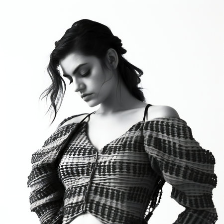 Model looks directly at the camera with a neutral expression while posing in a studio. The lighting highlights the features clearly. The background is dark and simple.