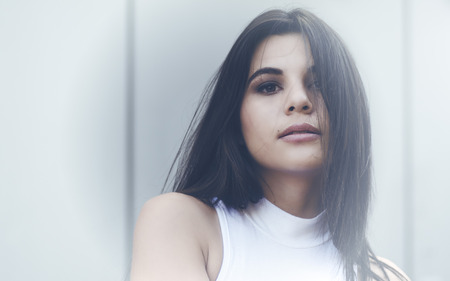 Portrait of a beautiful brunette woman in a white blouse