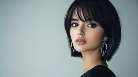 A captivating portrait of a young woman highlighting her short hair and elegant earrings against a soft neutral backdrop, embodying beauty and sophistication.
