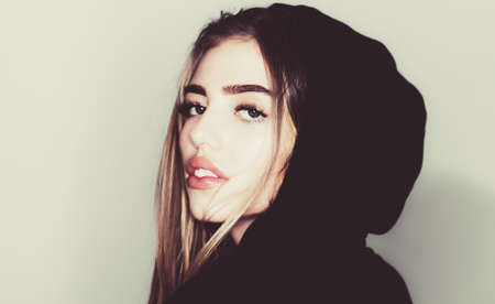 Woman face closeup. Fashionable girl on isolated gray.