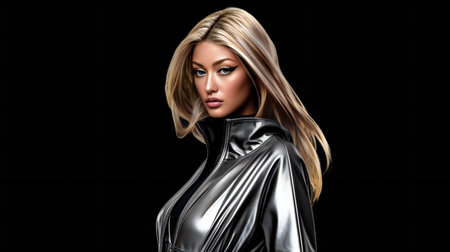 Fashionable blonde woman in black latex costume on black background.