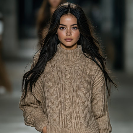 Model displays a stylish oversized knitted sweater in a bustling fashion show setting.