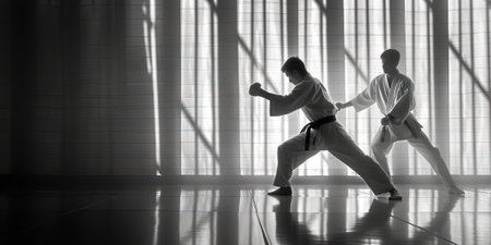 Silhouette of two karate fighters training in the gym. Black and white photo.