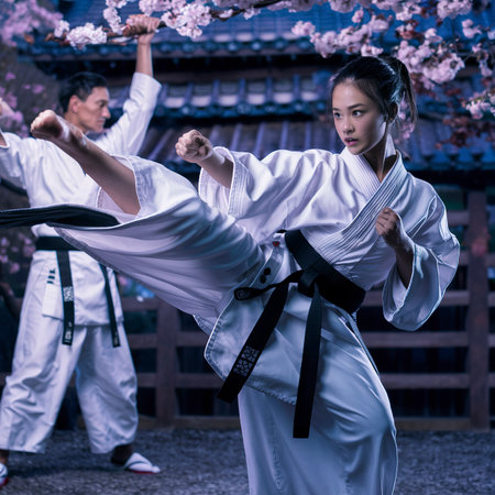 A determined figure stands poised, dressed in white gi with a black belt displaying power and focus.