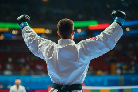 back view of boxer raises his arms in gloves proudly after competition